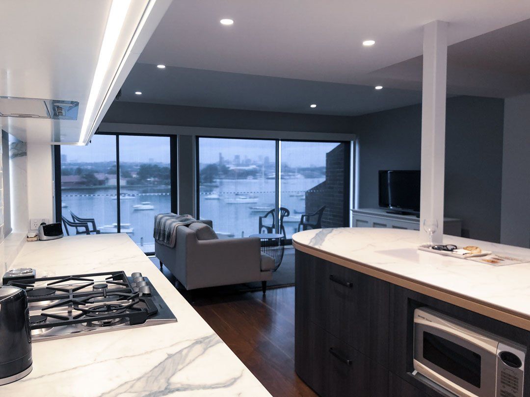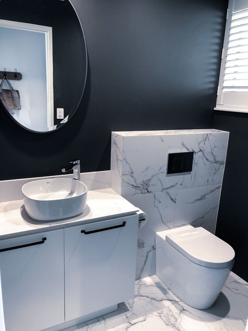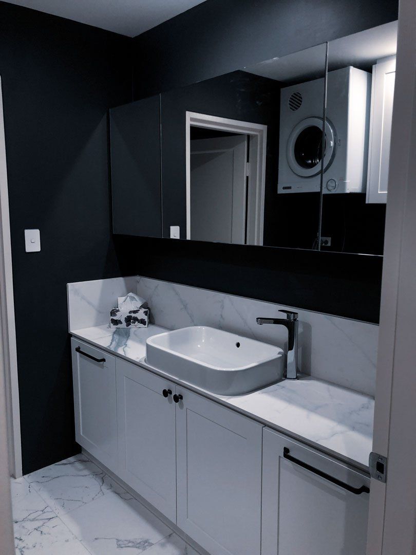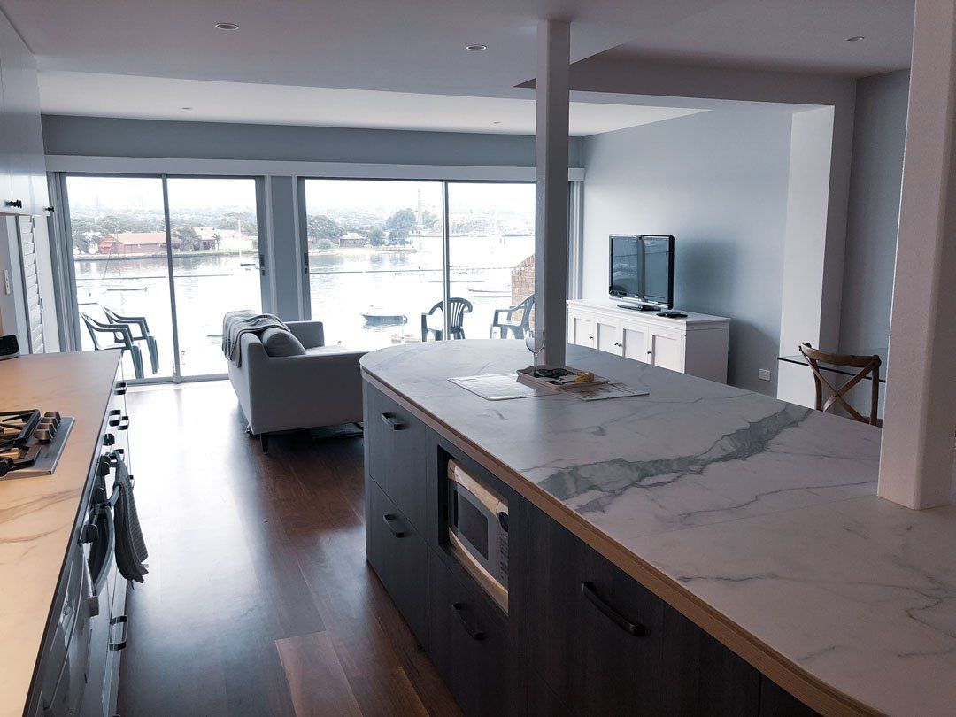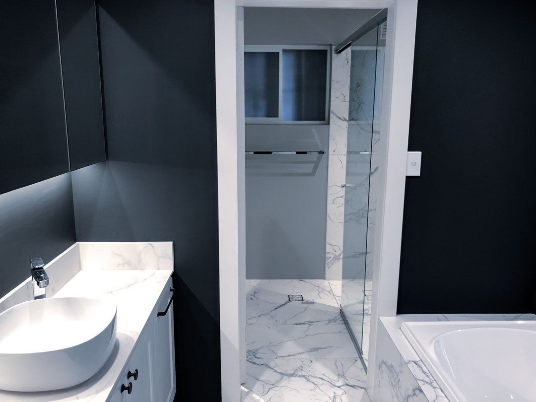 A tired kitchen and dated tiled flooring was removed to install beautiful hardwood timber, topped with a state-of-the-art kitchen with sleek lines and finishes. The bathrooms were completely redone with marble, white and cool grey tones to create a soothing experience. The upstairs flooring was replaced and storage built in to give the owners a more modern, tidy finish.